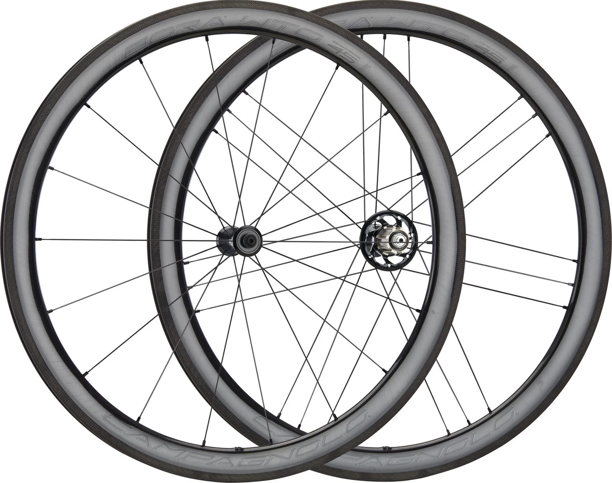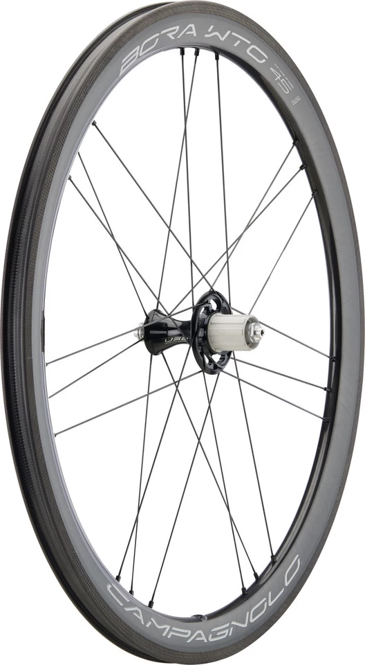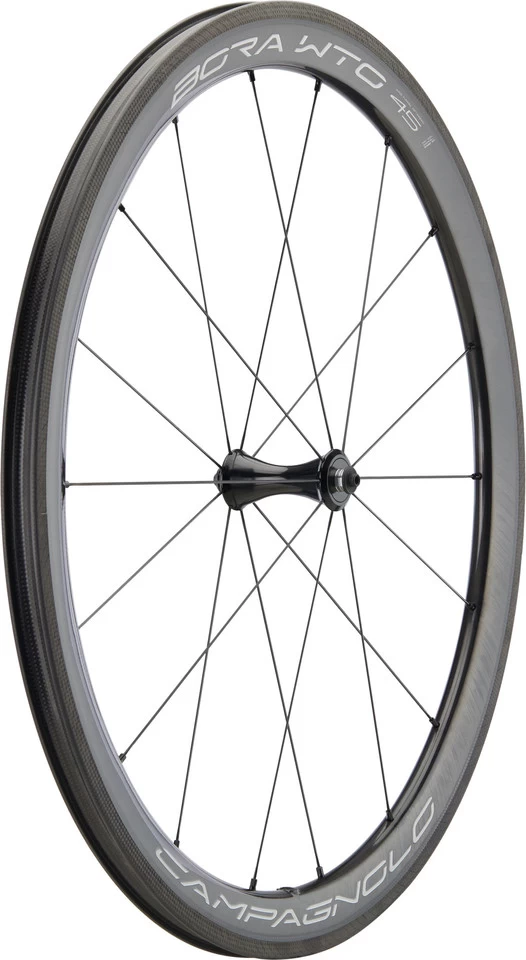 La paire de roues Bora WTO 28″ en carbone de Campagnolo a une hauteur de jante de 45 mm et convient aux vélos de route avec freins sur jante qui sont également utilisés en compétition.