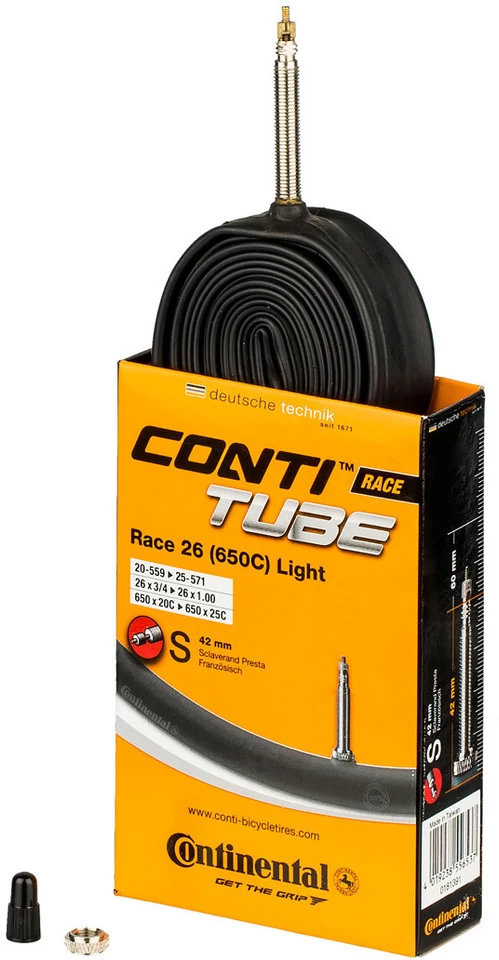 Désignation/synonymes : valve Sclaverand (SV), valve française, valve PrestaDiamètre extérieur : 6,5 mmAutres : la valve est dévissable sur toutes les chambres à air Continental avec valve SV (pour permettre l’utilisation d’un prolongateur de valve ou le remplissage avec un liquide anticrevaison, etc.).Contenu :1 x chambre à air Continental Race 26 Light
