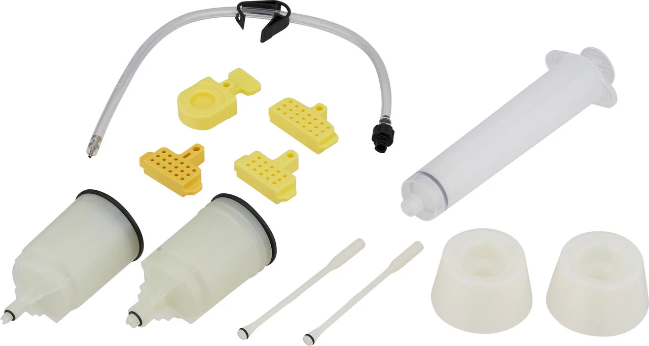 Le kit de purge professionnel TL-BR contient toutes les pièces nécessaires à une purge adéquate des systèmes de freins à disque hydrauliques de Shimano, aussi bien pour l’étrier que pour les leviers de frein. Il comprend la seringue de purge TL-BR001, qui est reliée en toute sécurité à l’embout de purge ou au socle de purge de l’étrier de frein au moyen du tuyau et de la pince qui sont inclus à la livraison. Il contient également l’entonnoir pour huile TL-BR003 pour les leviers de frein avec raccord M5, comme on en trouve principalement dans le domaine du VTT et de la randonnée. Mais l’entonnoir TL-BR002 fait également partie de la livraison pour les leviers de frein / de vitesses avec raccord M7 des vélo de route. Tu recevras également quatre blocs de purge compatibles avec différents modèles à deux et quatre pistons, qui serviront d’entretoises une fois les plaquettes de frein retirées. Seule l’huile minérale n’est pas incluse à la livraison.