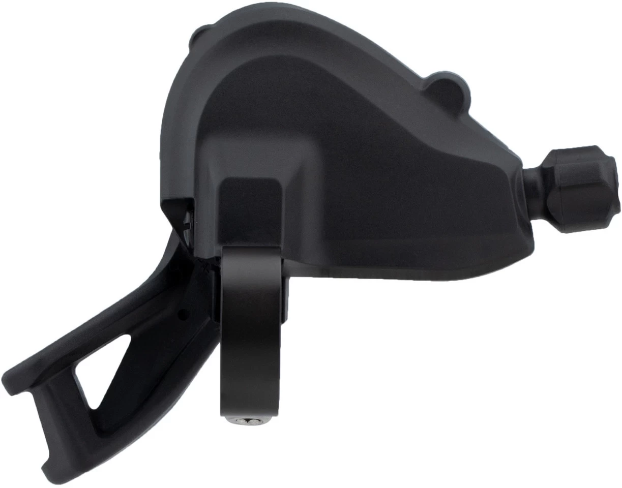 Les leviers de vitesses Shimano Rapidfire-Plus-Mono n’existent que pour le côté gauche, car ils actionnent le dérailleur avant. Contrairement aux modèles Rapidfire-Plus réguliers, il n’y a ici qu’un seul levier, qui est utilisé aussi bien pour monter que pour descendre les vitesses. C’est pratique et cela favorise le positionnement naturel des doigts. Tu changes facilement de plateau tout en continuant à tenir fermement le guidon et à te concentrer sur la conduite.
